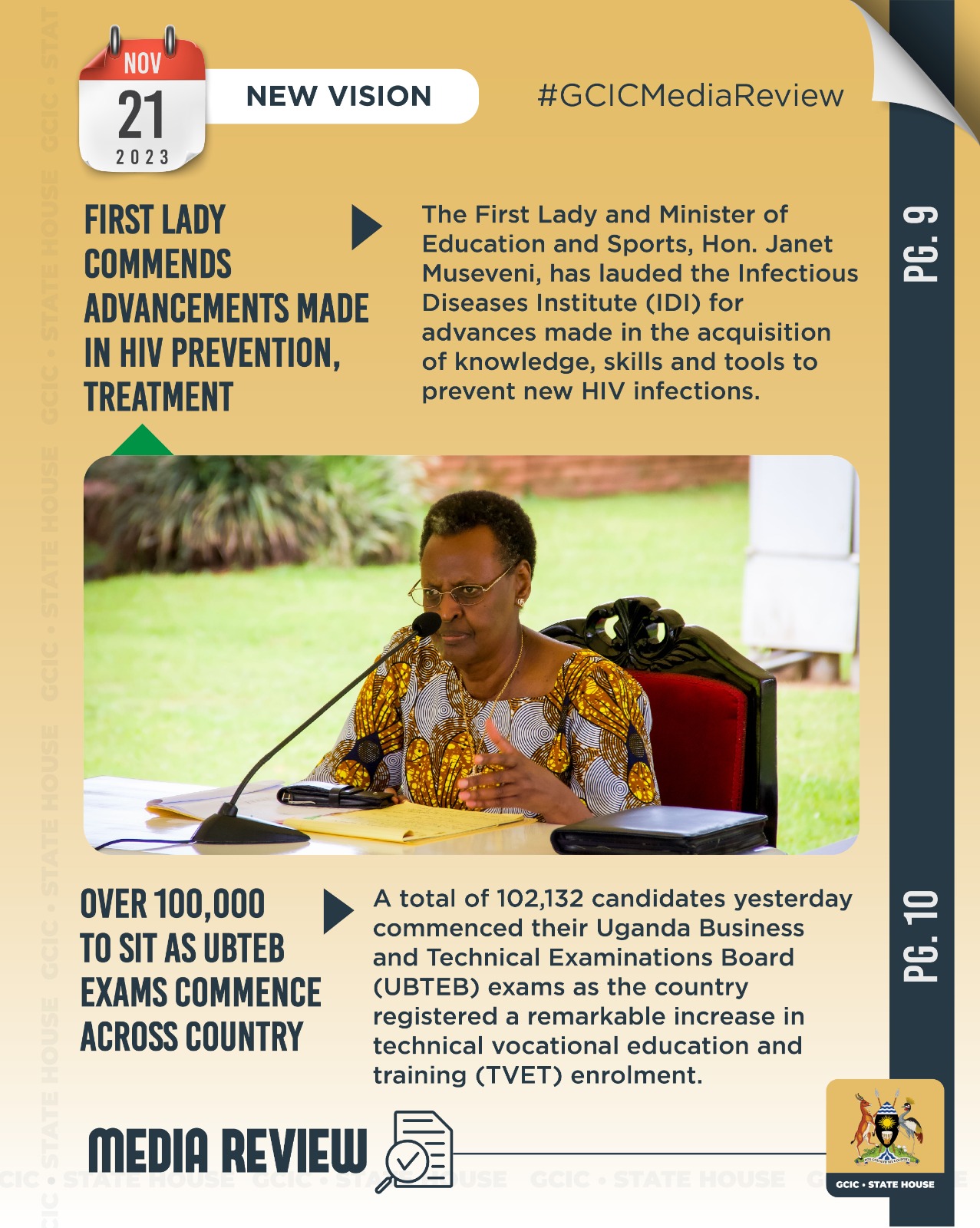 Summary: The First Lady and Minister of Education and Sports, Hon. Janet Museveni, has lauded the Infectious Diseases Institute (IDI) for advances made in the acquisition of knowledge, skills and tools to prevent new HIV infections