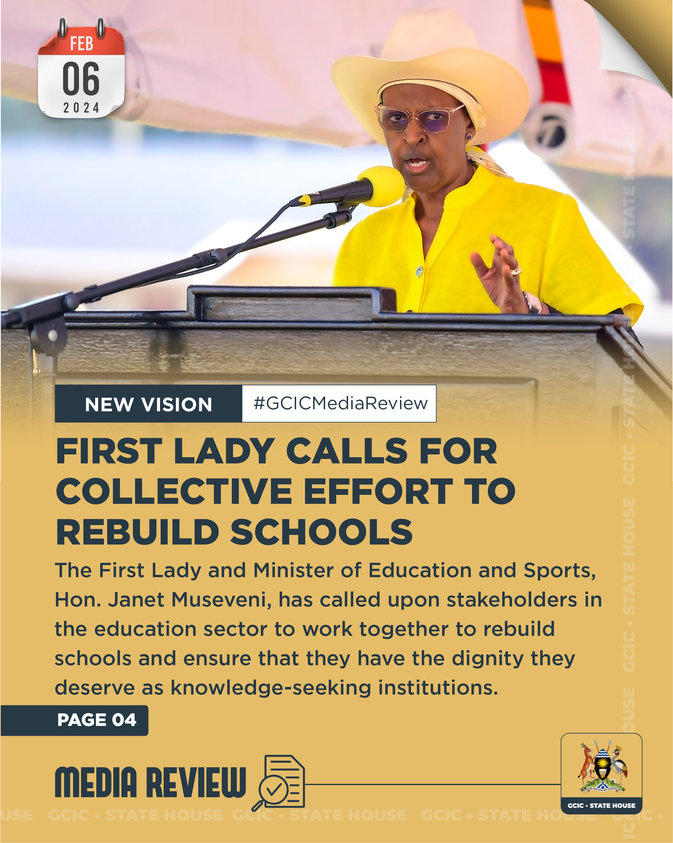 Summary: The First Lady and Minister of Education and Sports, Hon. Janet Museveni, has called upon stakeholders in the education sector to work together to rebuild schools and ensure that they have the dignity they deserve as knowledge-seeking institutions.